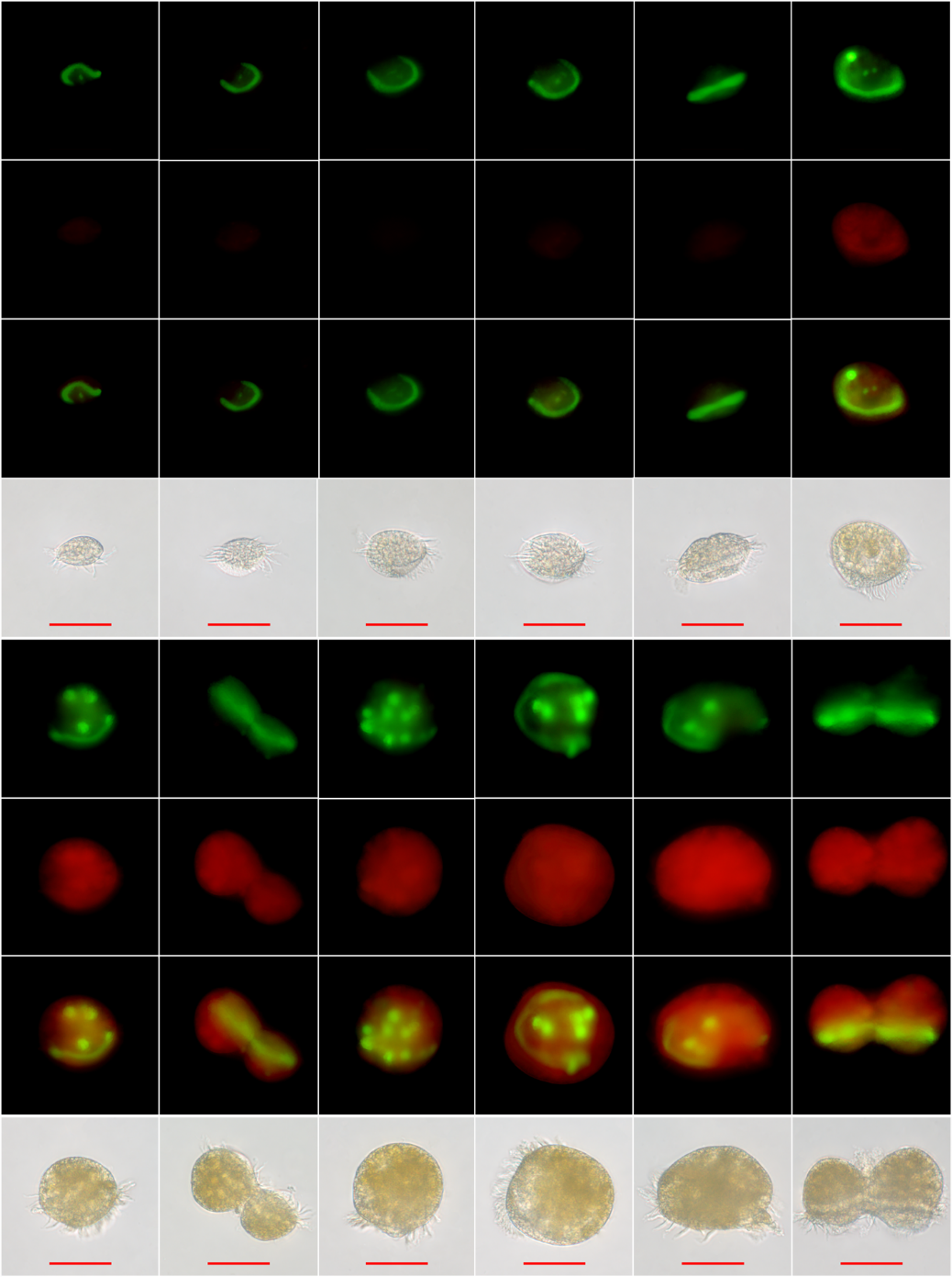 图1 波罗的游仆虫和米氏凯伦藻混合培养过程中的粒径多样性和色素积累情况。其中红色荧光为被摄食藻细胞的自发荧光;C形绿色荧光为使用SYBR green I标记的游仆虫的细胞核区域;明亮的绿色点状荧光为被游仆虫摄食但未完全消化的藻细胞核。比例尺 = 50 微米。