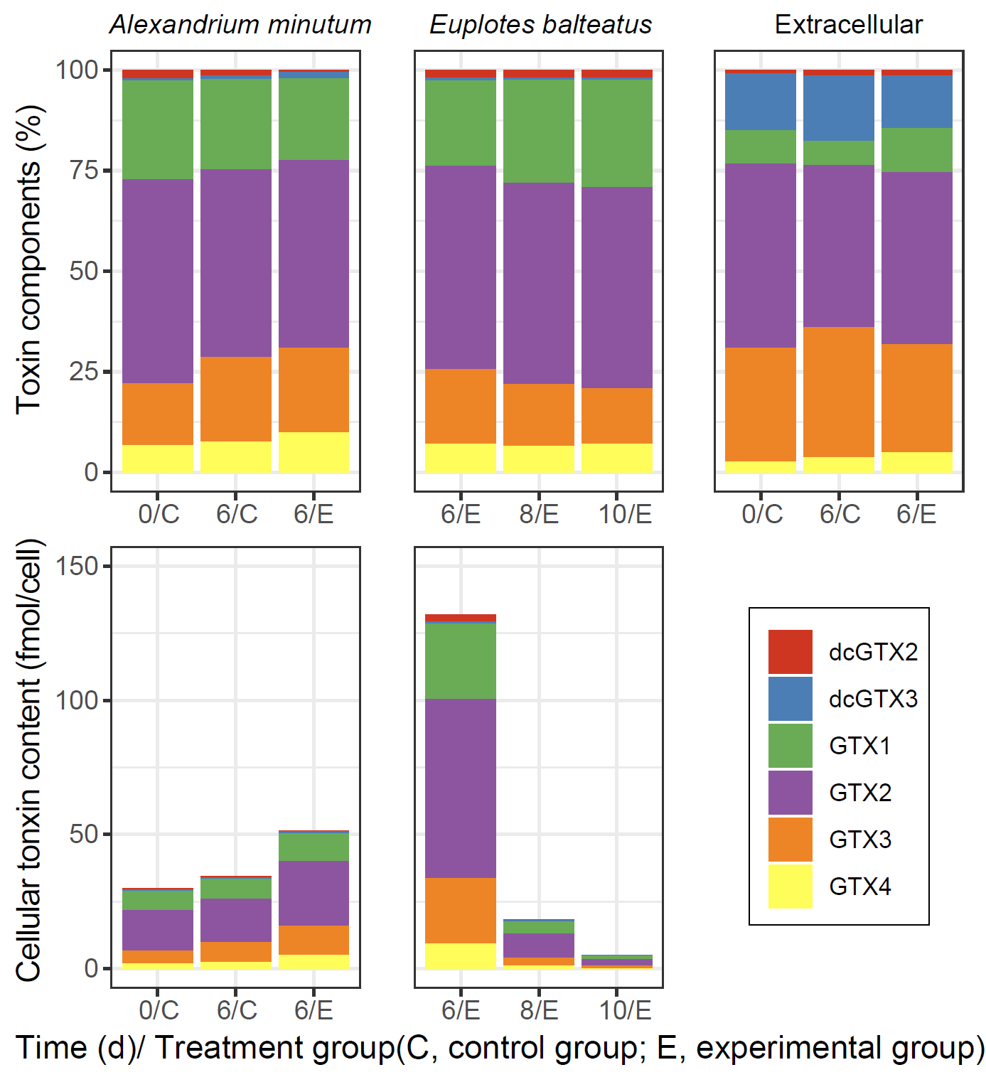 针对典型藻毒素——麻痹性贝类毒素,研究发现波罗的游仆虫对于微小亚历山大藻(Alexandrium minutum)的摄食作用能够有效降低藻华水体的整体毒性,尤其对于细胞内毒素具备极高的清除效率(>95%)(图4、5、6)。理论上讲,该过程能够阻断该毒素通过食物链传递,从而降低更高营养层级的生物受到毒素损害的风险。