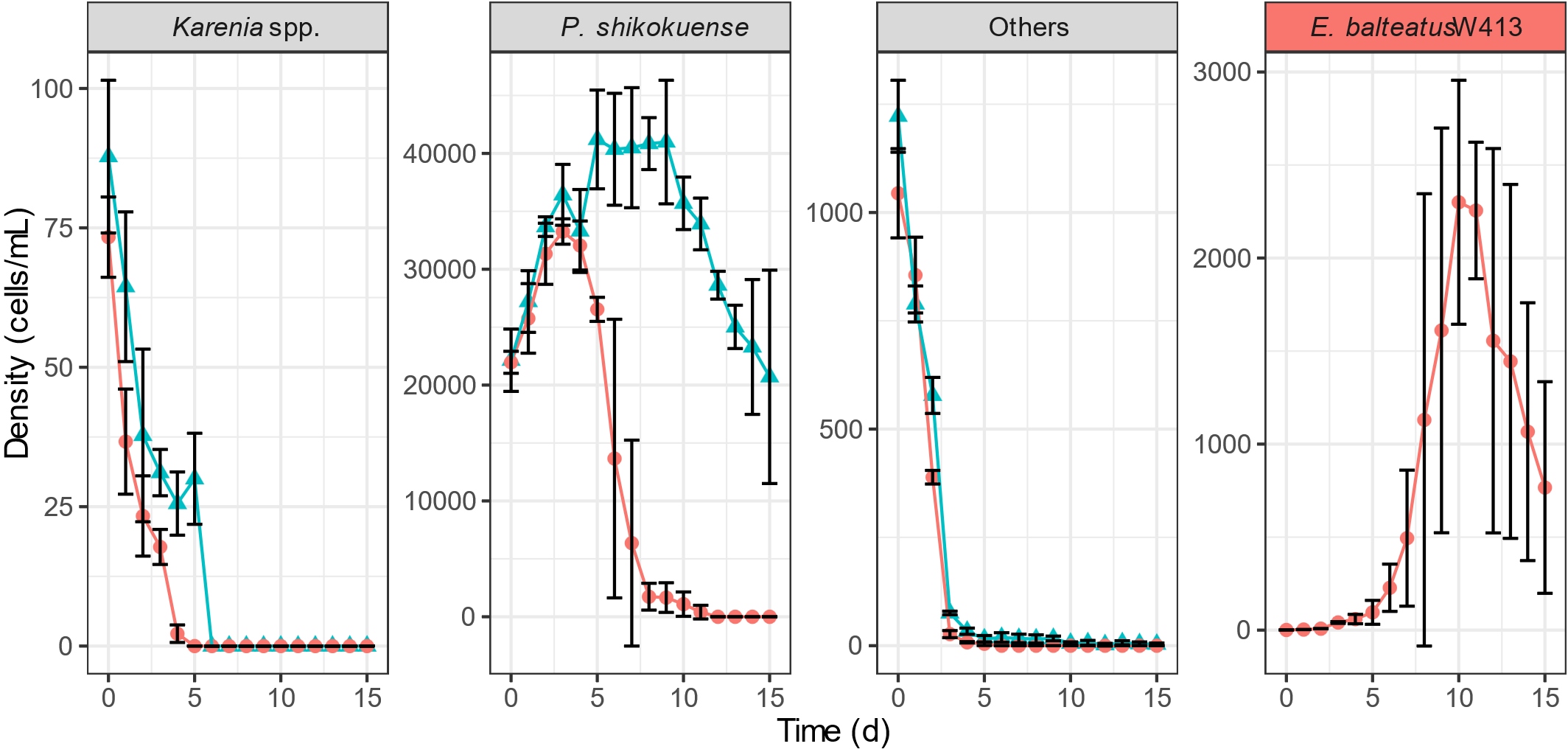 研究团队依托beat365英国官网网站原生动物种质资源库,对比研究了多种游仆类纤毛虫对米氏凯伦藻的抑制作用,筛选得到对米氏凯伦藻具备高效清除能力的波罗的游仆虫(Euplotes balteatus)(图1)。波罗的游仆虫对米氏凯伦藻的摄食率超过400 cells/E. b/d,生长率达到2.54 ± 0.32/d;根据初始密度的不同可以在4至7天内清除密度高达30,000 cells/mL的米氏凯伦藻;同时,以极低的初始密度(~0.01 cells/mL)限制营养加富条件下米氏凯伦藻藻华的发展(图2)。对于采集自福建平潭的赤潮水样研究发现,波罗的游仆虫表现出对混合物种赤潮的潜在调控能力:在有效控制凯伦藻属细胞密度的同时,清除水体中共生的东海原甲藻(Prorocentrum shikokuense(= P. donghaiense))(图3)。