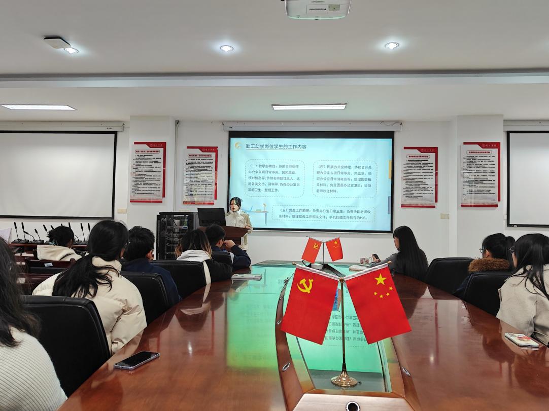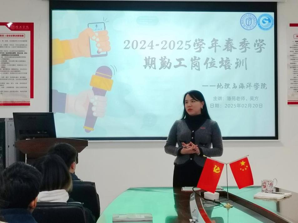 2025年2月20日中午,地理与海洋学院于广成楼B306会议室开展2024-2025学年第二学期勤工助学岗位培训会。培训会由学院勤工助学部指导老师潘苑、学院勤工助学部干部吴方主持,学院全体勤工岗位学生参与。