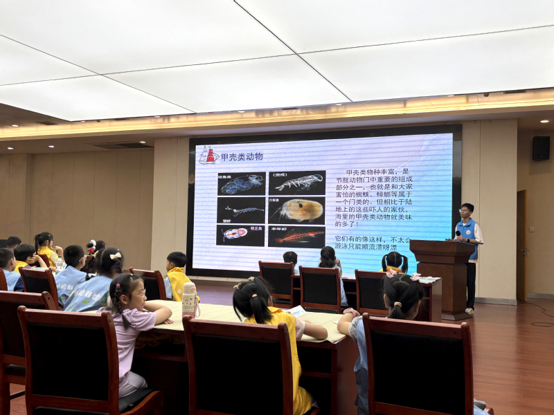 海洋资源与环境专业学生林万涛为孩子们介绍各种神奇的海洋生物,从瑰丽绚烂的水母到色彩艳丽的海蛞蝓,从灵活柔软的章鱼到横行霸道的螃蟹。林万涛同学生动形象的描述与提问式互动,让孩子们在轻松愉快的氛围中认识到许多奇特的海洋生物。