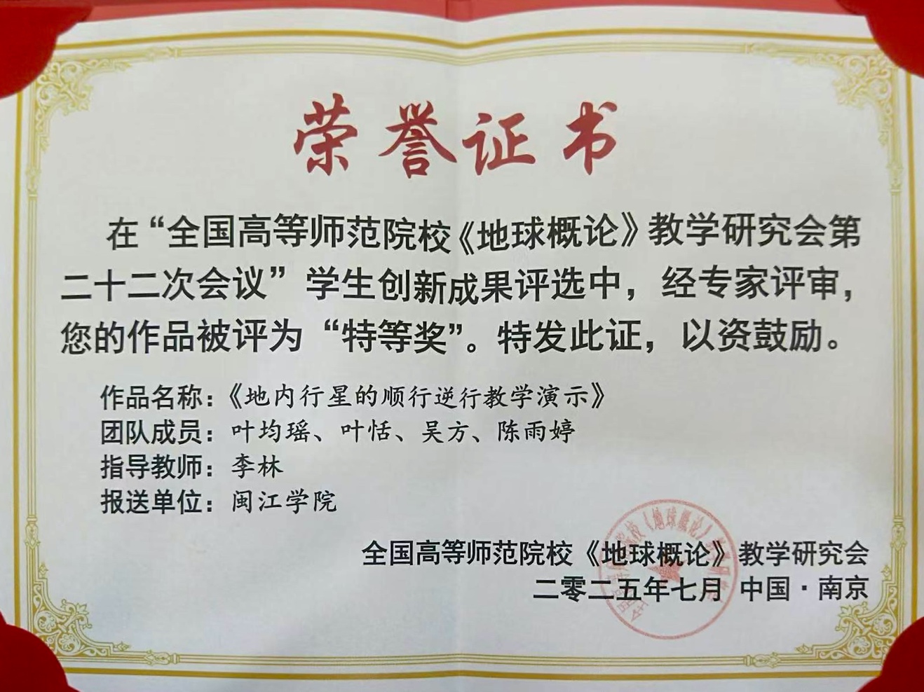 近日,全国高等师范院校《地球概论》教学研究会在江苏南京举行。由叶均瑶、叶恬、陈雨婷、吴方四位同学组成的参赛队伍凭借其创新成果《地内行星的顺行逆行演示》,在《地球概论》创新成果比赛中脱颖而出,斩获“特等奖”,团队指导老师李林老师荣获“优秀指导教师”称号。