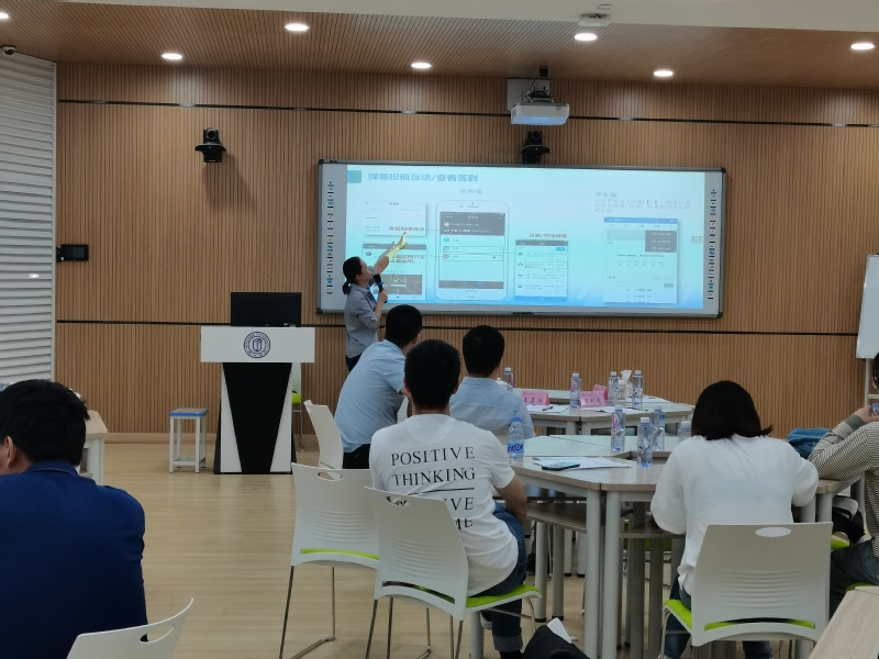 张利楠以“雨课堂助力智慧教学”为题,从怎么下载雨课堂,如何通过雨课堂进行授课、雨课堂如何推送材料、雨课堂专业版的升级变化四部分对“雨课堂”教学平台操作进行讲解。雨课堂基于PowerPoint和微信,快捷易上手,将课前-课上-课后的每一个环节都赋予全新的体验,最大限度地释放教与学的能量。课前,教师可以发布学习课件,提醒学生进行学习,教师也可以查看学生预习情况。课堂上,任课教师可以通过插入视频,限时发题,随机点名,学生发弹幕提问,课堂红包等实现师生在线互动。课后,教师可以制作试卷,布置课后习题。学生也可回放直播课程,遇到不懂的问题可通过“投稿”向老师提问。参训老师通过扫描二维码,参与了问答互动等环节体验了雨课堂良好的课堂互动氛围、及时的授课反馈情况、多样的智慧教学形式,深切感受了手机进课堂、“互联网+”智慧教学工具辅助提升课堂教学效果的全过程。