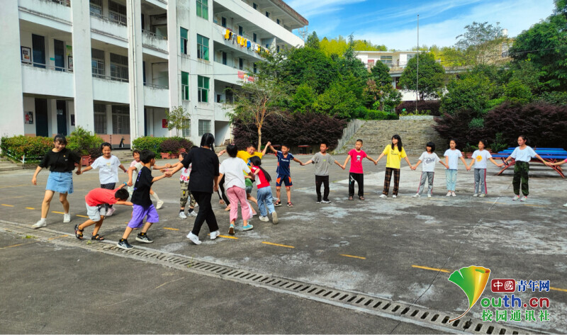 图为实践队开展团体运动课程,实践队员带领小朋友做“穿针引线”游戏。中国青年网通讯员 华绪庚 供图