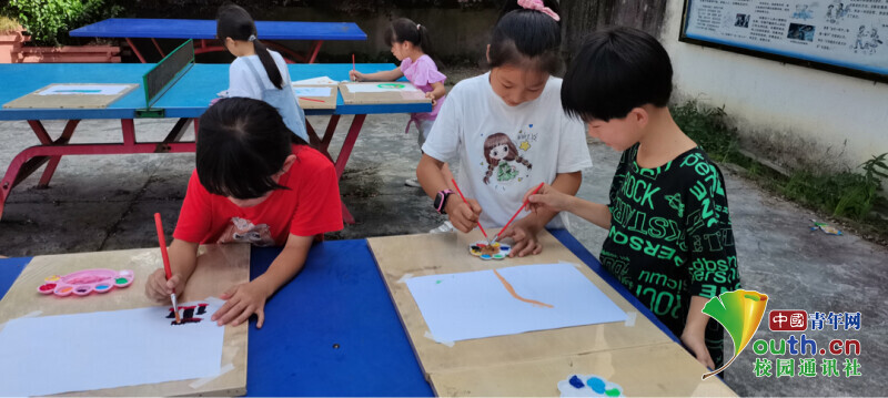 图为实践队开展绘画课程,小朋友们正在室外乒乓球桌上画彩绘。中国青年网通讯员 华绪庚 供图