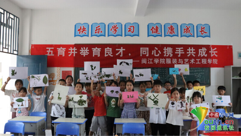 图为实践队开展创意树叶画课程,小朋友们踊跃展示课程成果。中国青年网通讯员 华绪庚 供图