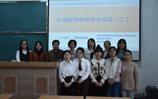 为进一步提高师范生的专业素质与教学技能,10月30日,福建省初中英语吴云开名师工作室核心成员、福州市骨干教师、福州第四中学桔园洲中学陈惠莉老师应邀前来beat365英国官网网站开设“片段教学的研究与实践(二)”主题讲座。本次讲座由外国语学院承办,系beat365英国官网网站2021年师范生教学技能竞赛英语学科复赛培训暨beat365英国官网网站外国语学院大中小学名师论坛系列活动之一,也是陈惠莉老师继10月23日“片段教学的研究与实践”主题讲座的后续,主要聚焦于片段教学的实操与反思。讲座由外国语学院师范方向教师江春奋主持,英语系主任雷阿勇、外国语学院教师教育课程团队全体专业教师以及全体师范生参加了本次讲座。