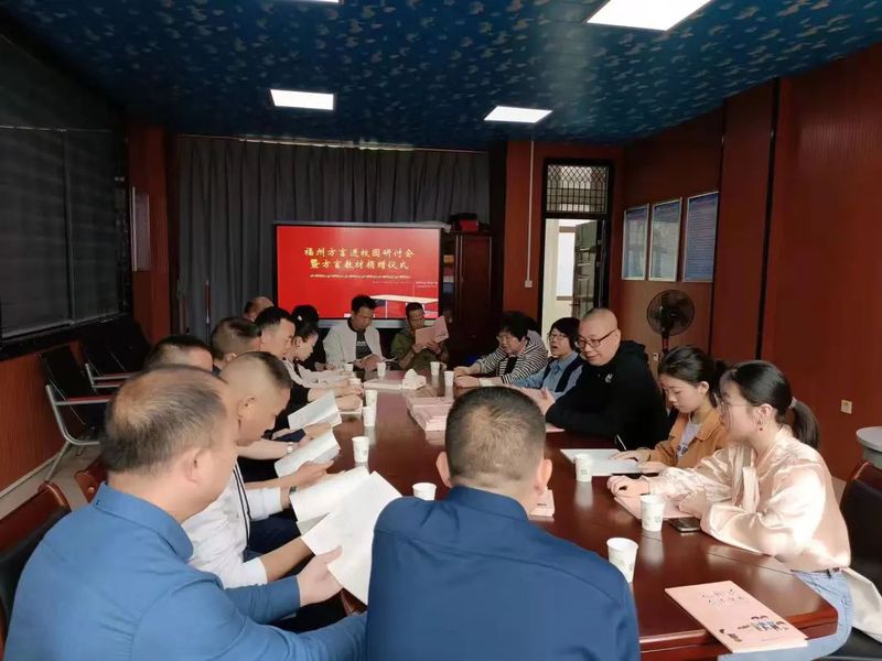 随后,考察队前往永泰县教师进修学校,与永泰县的十二所中小学领导进行了福州方言进校园与师范办学有关问题进行座谈。座谈上,练暑生副院长首先介绍了人文学院师范办学现状和方言进校园工作。与会的永泰县中小学领导结合本校办学情况畅所欲言,围绕乡村语文教师培养、推进方言进校园、师范生实习等工作提出了一些建设性意见建议。86级中文系校友、永泰县教师进修学校中学教研室副主任赖东明介绍了当下乡村语文教育的现状和困境,并提出富有真知灼见的意见和建议。座谈会上还举行了《福州话会话课本》赠书仪式。
