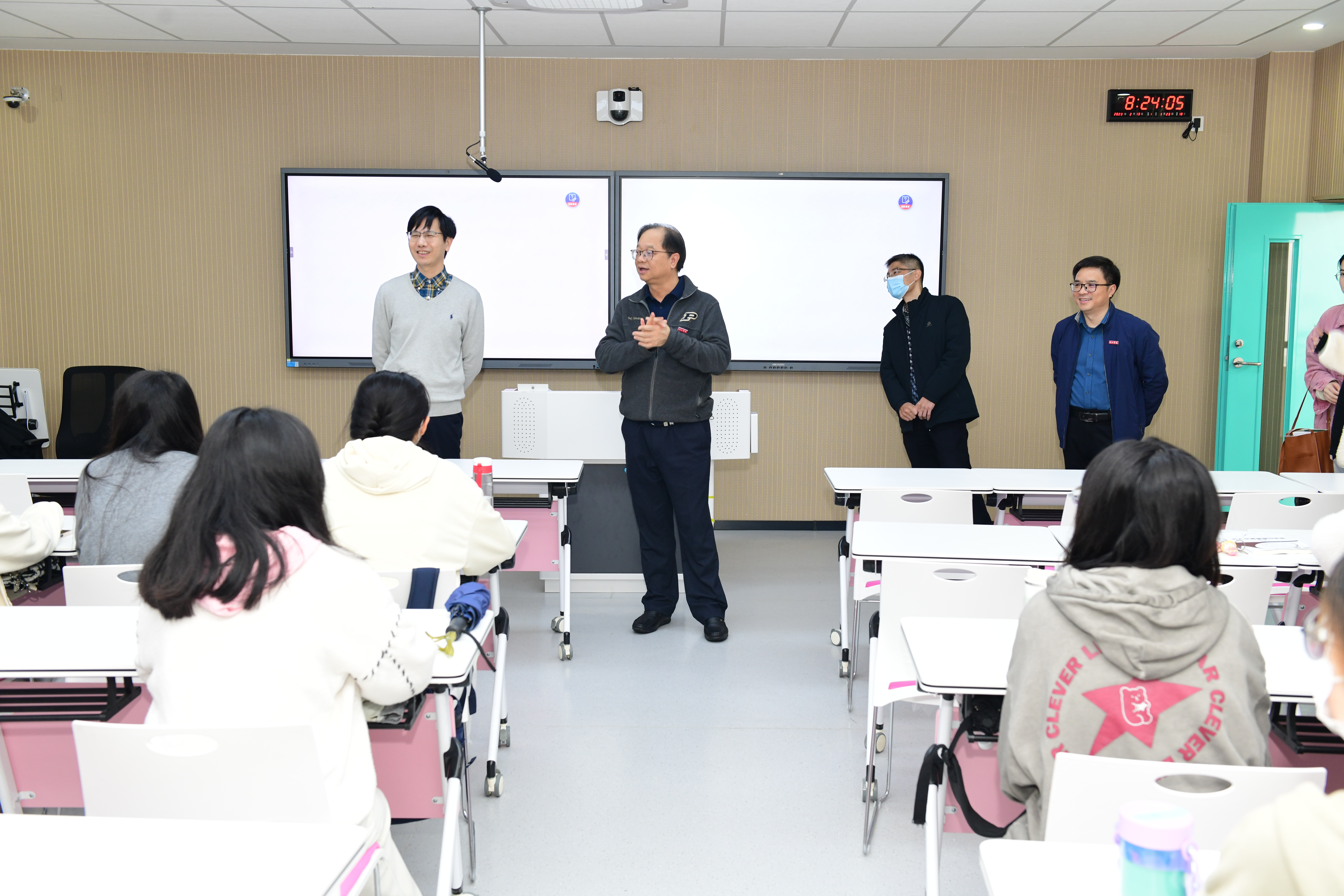 校领导走进教学视频督导室,运用终端平台观看智慧教室教学演示,详细了解智慧教室及智慧教学一体化平台的设施功能及对日常教学的支撑保障情况,对双师型教师、外籍教师等教师线上直播课程进行在线巡课检查。