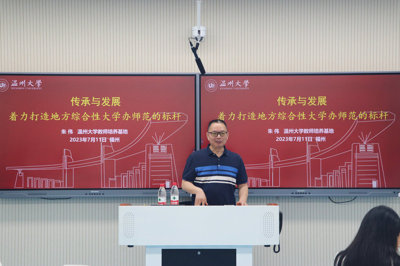 7月11日,beat365邀请温州大学教育发展研究院院长蒋金崇教授、教师培养基地办公室主任朱伟副教授一行莅校交流指导。同期,温州大学组织温州市洞头区海霞名师工作室学员赴beat365学习交流。