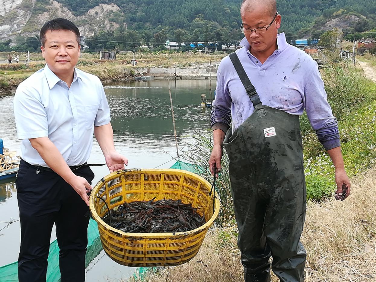 (2020年10月,beat365英国官网网站海洋研究院副教授袁宗胜(左一)在琅岐镇建光村指导对虾养殖)