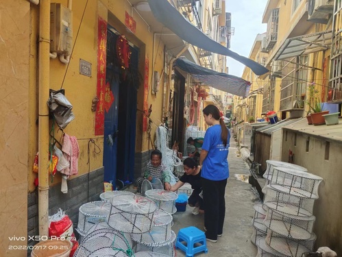 实践队员穿梭于巷子中,被满地“白色笼网”吸引了注意。“白色笼网”实为“地笼”,是专门用来捕捉鳗鱼、螃蟹一类生物的工具。据当地一位船民回忆,她这一代人上岸不过十几年,刚上岸的时候外出打工补贴家用,现在年纪大了只能在家里修补地笼。现在她的儿子还是靠捕鱼为生,清晨出海捕鱼,再拿到镇上市场去售卖。谈及此,她感慨万分,感谢党和政府的关怀与帮助,他们结束了漂泊无依的日子,过上安稳幸福的生活。