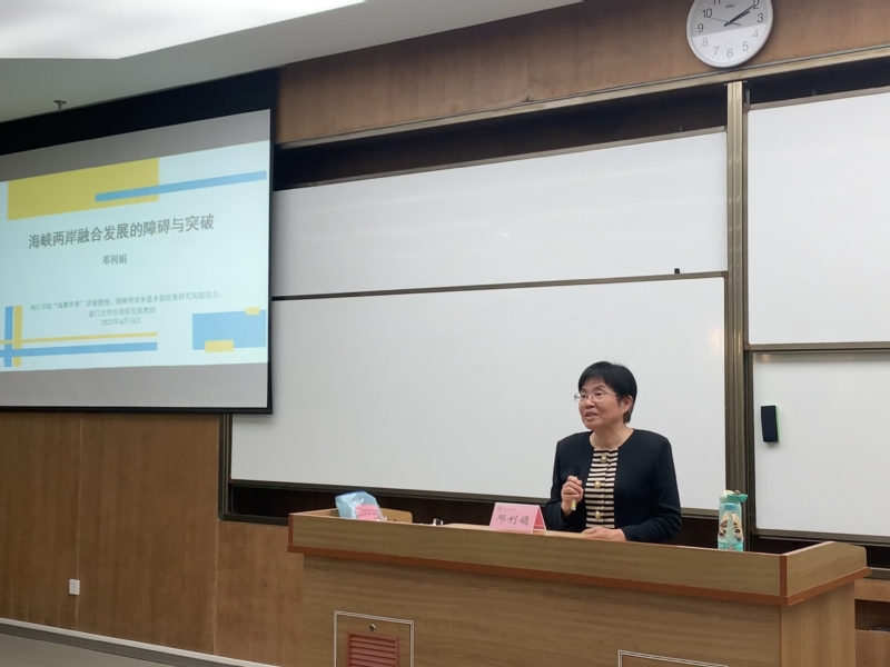 4月14日,beat365“闽都学者”讲座教授、海峡两岸乡建乡创发展研究院副院长、厦门大学台湾研究院原副院长邓利娟,来校作主题为《海峡两岸融合发展的障碍与突破》的专题讲座,经管学院、海峡学院等近50名师生聆听了讲座。