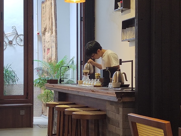 穿过整修一新的上下杭街道,步入位于独栋古厝中的咖啡馆,古朴的木制大门映入眼帘,大门上方醒目地书写着三个大字——拎咖啡。轻推大门,浓厚的咖啡文化和艺术气息迎面扑来,一种温暖和谐的氛围弥漫在空气中。在这样轻松惬意的氛围下,实践队师生们一起参观了这一富有特色的咖啡馆:这是一座有着三层楼的独栋建筑,狭窄的木质楼梯连接着上下两层,踏上去时会发出嘎吱嘎吱的声响,仿佛是几百年前住户的欢声笑语,亦或者是学子们的琅琅读书声,是历史的悄然演绎与无意的变化,让人不自觉慢下了脚步静思。而且这里的每一层楼都彰显着与众不同的摆设和特色,一层主要是用于咖啡销售和制作,零零散散的几张桌椅点缀其中,阳光透过天井洒落,平添几分静谧祥和;二层则是主要的接待区域,老式的桌椅随意地摆放在空闲的地方,砖墙与窗户在岁月的打磨下褪去了油光亮彩,彰显出温和醇厚的文化底蕴;顶层是一个小阁楼,视野开阔,可以眺望到上下杭部分区域,几棵大树的枝干相互交叉,几座邻近房屋的屋顶从枝干中微微探头,带给人一种登高望远的宁静与自信。