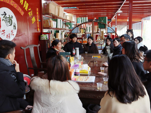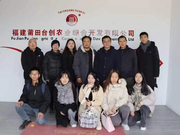 随后,实践队走进了福建莆田台创农业综合开发有限公司,对企业相关人员进行访谈与实地调查。队员们初步了解到:该公司是仙游县国家级台湾农民创业园的代表性企业之一,也是集育苗、种植、产品开发、销售和观光于一体的农业综合开发类企业。早期是年出栏近五万头的花园式生猪养殖场,同时引进种植一些嘉宝果;目前公司致力于打造嘉宝果生态种植示范基地,旨在适应当前发展形势并推动乡村特色产业发展振兴。交流座谈中,邓教授强调,台创公司的前瞻性不仅仅在于率先引进、种植嘉宝果及本身的适应性和产品质量,也在于嘉宝果产品的独特功效、系列化开发利用及公司所承载的人文情怀。对此,台创嘉宝果企业负责人陈正信、叶丽清夫妇表示,公司的文化内核是品质至上、感恩社会、绿色健康、开拓创新,以人为本。展望未来,企业将致力于传递高品质的生活理念,砥砺前行,不断扩大嘉宝果的生产规模,力求为消费者贡献真正绿色、纯正、营养、健康、多元化的嘉宝果产品,打造仙台现代农业合作标杆品牌。双方还就嘉宝果企业发展战略等进行了意见交流,实践队成员提出要立足当地乡村资源禀赋,集中力量打造仙游县嘉宝果的特色品牌,并规划种植重点发展区和种养结合发展区,同时共同探究两岸相关标准制定,推进闽台融合发展背景下区域特色嘉宝果产业发展。