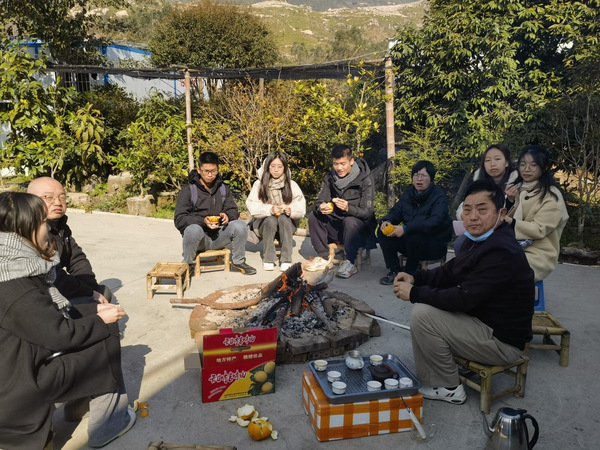 料峭寒风冬意浓,但师生们学习交流与实践探索的热情不减!在创业园管委会傅加兴副主任的带领下,1月24日一早实践队师生一行8人首先来到了坐落于仙游县榜头镇后阪村的台资企业莆田市南阳果树开发有限公司。在公司负责人的热情引导下,师生一行饶有兴趣地参观了南阳果树苗木培育与种植基地,并围着火炉一起交流、研讨仙游县特色果业发展情况及南阳果树基地建设历程与下一步计划。实践团队了解到南阳果业有限公司是由鞋业转型而来的,通过近年的摸索正积极引入、试种较适合当地种植的外来高品质特色果树苗木,一些苗木甚至远销其他省区乡村;尤其是得益于仙游县高海拔地区肥沃的土壤和适宜的气候条件,当地枇杷、桔柚等果业种植全程绿色无污染、品质优良,南阳果业借助当地自然资源、生态环境与政策等方面优势,逐步走出一条以健康、绿色、多元为核心的有机果业助力乡村振兴之路,通过企业发展与产业升级带动周边经济发展。