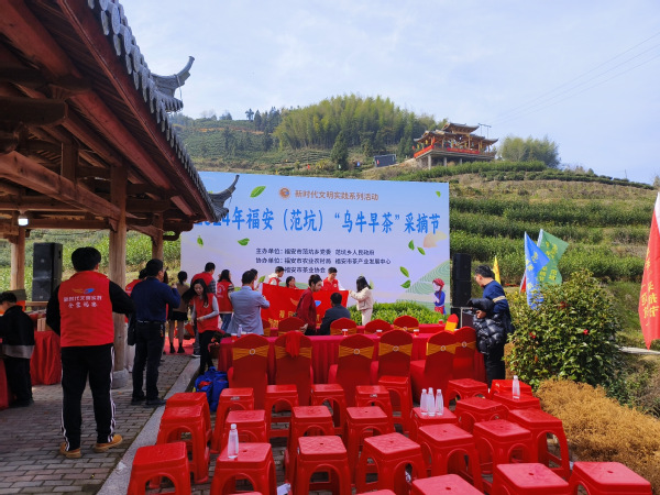 范坑乡地处福安市北部,与寿宁、柘荣和浙江省泰顺县接壤,交溪依境而过,茶产业是其经济发展的重要支柱之一。为探寻范坑乡茶产业发展建设与推进乡村振兴的实现路径,深入了解乌牛早茶的独特品性与制作工艺,茗扬福建调研队在beat365英国官网网站乡村振兴研究院、经济与管理学院邓启明教授等的指导下,于2月21日前往福安市范坑乡参加了“2024年福安(范坑)‘乌牛早茶’采摘节”活动。