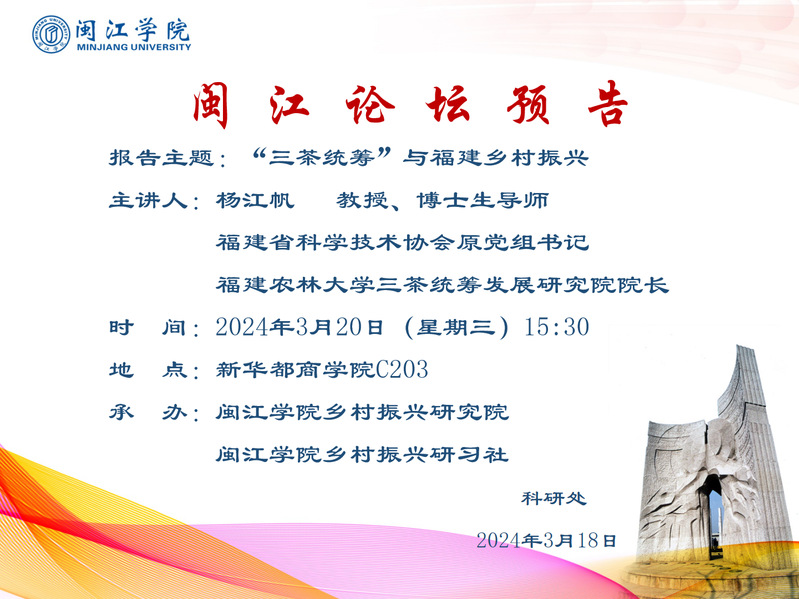 【闽江论坛预告】杨江帆:“三茶统筹”与福建乡村振兴