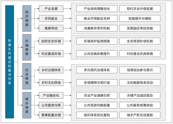 宜居宜业和美乡村建设的目标任务具有全方位、多层次特点,涉及生产、生活和生态各个领域。“产业美”是乡村经济建设与乡村振兴的重要基础,重点关注产业多元融合发展,有助于乡村经济效益和农民收入水平的提高,是乡村可持续发展的重要动能;“生活美”是乡村社会建设的根本需求,是以人为本价值观的综合体现,通过提供更优质与更公平的城乡公共服务和基础设施配置,提高乡村居民的生活质量,保障村民平等地参与乡村建设,共同分享乡村振兴的成果;“风情美”是乡村价值展现与精神文化发扬的重要举措,通过保护和传承乡村文化及历史遗产,转变思想观念与传承精神内涵,有助于增强乡村的文化软实力,实现和谐乡村社会构建;“生境美”是乡村价值复兴与多功能转型的基本原则,关键在于保护和修复乡村的生态环境,提高乡村人居环境品质,为绿色健康新业态提供可持续发展基础;“治理美”是基层政治建设和乡村适应性治理的重要保障,重点在于强化乡村治理能力和民主管理,优化组织建设与决策机制,推动乡村社会和谐稳定。综上所述,和美乡村之“五美”互为表里,互通互融,是实现乡村全面振兴的关键所在。