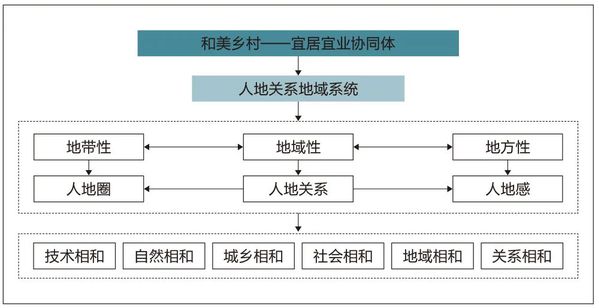 “和美乡村”是对“美丽乡村”的继承与发展,其在“美”的基础上,更强调“和”的内在价值。“和”的本义与和谐、包容、协同等存在紧密联系,这也指明“和美乡村”建设不能仅将视角落在乡村自身层面,还应从更广阔的城乡区域范畴进行统筹思考。在人地关系的地域系统中,乡村被视为一个复杂的地域系统,其内部结构错综复杂,与外部不同层级的区域之间存在密切的联系并相互渗透。因此,对“和美乡村”的解释,应从不同层级地域系统协同发展的视角。向上,拓展到全球地带性;向下,聚焦细化到地方性。实现对乡村建设发展的综合分析,挖掘“和美乡村”建设的模式与规律。“和美乡村”建设的价值导向,应从技术、自然、城乡、社会、地域和关系六个方面综合考虑,从而推进宜居宜业乡村“协同体”打造(图2)。