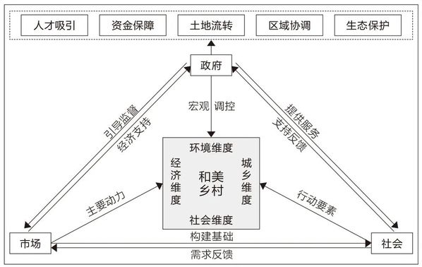 作为“和美乡村”建设的三大重要主体,政府、市场与社会之间并非孤立、割裂的,而是相互作用、相互影响的,它们共同推进新时代乡村建设。在实际建设过程中,政府引导并监督市场发展,市场则为政府提供经济支持;政府统筹为社会提供公共服务,社会为前者提供群众支持和需求反馈;市场资本的注入为社会构建提供发展基础,而多元行动者积极的社会参与,也为市场发展提供了需求和反馈。在三元主体的共同作用下,考虑到宜居宜业和美乡村的基本内涵与建设重点,新型村镇体系构建,应重点关注人才吸引、资金保障、土地流转、区域协调、生态保护这五个方面的优化升级,全面推动乡村振兴。