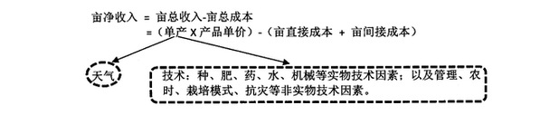 无论是产品价格还是投入物价格,价格的变动不由农民掌控,而是由市场供求关系所决定的。成本是投入物种类及其数量与单价的乘积,成本的高低,一是取决于农户不能决定的投入物价格,农户是市场价格接受者;二是取决于农户可以掌控的投入物种类和数量,从而影响到成本。当用金额来反映投入物种类、数量、质量及其组合时,可称之为成本;当不考虑金额,只是关心各种投入要素及其关系时,比如种、肥、药、水、机械等可计数的以及管理、农时、栽培模式、抗灾等不可计数的影响生产的各种要素,这往往被称为技术。