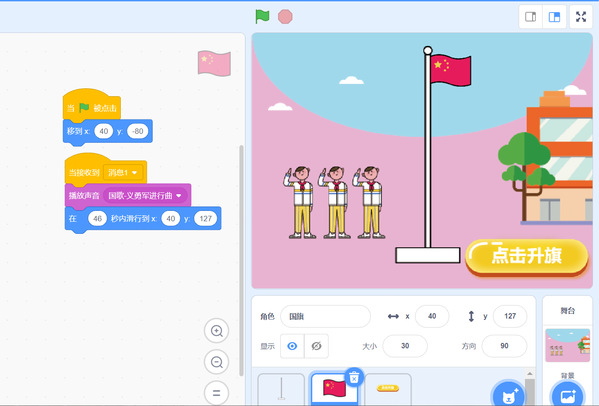 据介绍,本次编程Scratch+基础课程与思政跨学科融合,通过开设编程+思政、编程+红色文化教育、编程+爱国主义教育等课程,不仅提高学生的编程技能,还促使学生在学习过程中深入了解国家的历史、文化和价值观实践队员通过Scratch软件演示升旗动画、认识党旗动画、学习爱国古诗动画等,以红色文化红色故事为切入点,通过“大手”讲解中共党史、科技发展和民族精神,弘扬红色血脉、传承红色精神“小手”明白爱国、创新、科技等重要性,同时鼓励祖国花朵勇时代的接班人和答卷人,向着实现中华民族伟大复兴的中国梦而奋勇前进