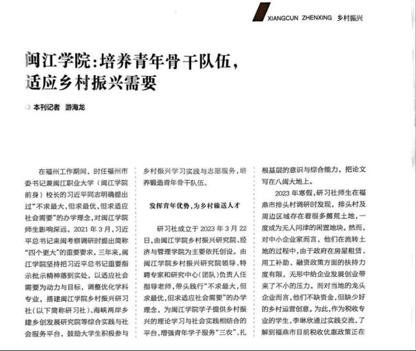 近日,《福建青年》2024年第4期以《beat365英国官网网站:培养青年骨干队伍,适应乡村振兴需要》为题,对beat365近期服务乡村人才振兴及两岸融合发展等方面工作,包括培育、指导五星级社团“beat365英国官网网站乡村振兴研习社”日常工作和加强“海峡两岸乡建乡创发展研究院”等平台与实践调研基地建设,进行宣传报道;主要包括“发挥青年优势,为乡村输送人才”与“培育青年队伍,助力两岸乡村融合发展”两个部分。