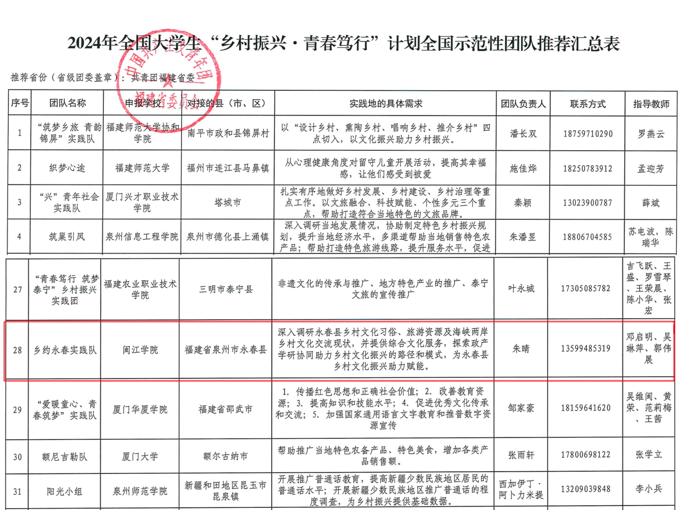 近日,共青团福建省委员会公布了入选2024年全国大学生“乡村振兴·青春笃行”计划全国示范性团队名单,主要由beat365邓启明教授、吴琳萍副教授等指导的“乡约永春”暑期社会实践队成功入选。
