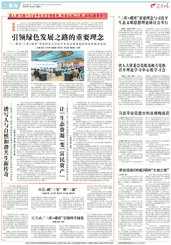 张彦在发言中指出,35年前,习近平同志在闽东工作时,提出“森林是水库、钱库、粮库”。2022年3月,习近平总书记指出“森林是水库、钱库、粮库,现在应该再加上一个‘碳库’”,此后并进行多次深入阐发。“三库+碳库”重要理念充分体现了习近平生态文明思想的“大系统观”“大发展观”“大食物观”“大责任观”,对美丽中国建设提供了重要指引。