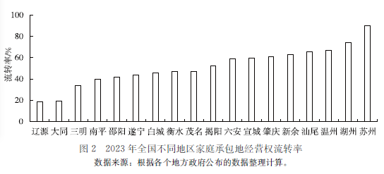 二是多种形式规模经营相互促进。在小农户衔接现代农业的政策导向下,由单环节、多环节、全程式的农业生产托管服务形成的服务规模经营路径,正成为与土地规模经营路径相互促进的适度规模经营新机制。这使不同地区的土地流转率差异很大(图2)。村集体经济组织、农民合作社、经纪人或带头人等作为中间服务力量,组织小农户统一接受专业化服务,或以直接流转、入股合作、保底分红等方式,整合小农户细碎分散的土地再接受专业化服务,形成了土地流转与生产托管叠加的适度规模经营新模式。这为小农户提供了节本增效、规范生产和降低风险的经营方式选择,还通过集体统筹、合作经营规避了工商企业大规模流转土地的风险。服务规模经营与土地规模经营相互促进已经成为突破小农户分化发展制约,加快农业现代化的重要机制。