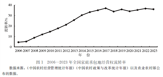 三是进入21世纪以来,以巩固和完善基本经营制度为主线,促进小农户与现代农业发展有机衔接为新方向,不断丰富立体式复合型现代农业经营体系。党的十八届三中全会就加快构建新型农业经营体系,强调坚持家庭经营在农业中的基础性地位,推进家庭经营、集体经营、合作经营、企业经营等共同发展的农业经营方式创新。2013年中央农村工作会议强调,加快构建立体式复合型现代农业经营体系。围绕培育新型农业经营主体,各地行政推动土地经营权流转,发展种养大户、家庭农场、农民合作社、农业公司等。但老弱农民流转土地经营权意愿低的客观现实(图1),让理论研究和政策制定都认识到小农户将贯穿中国农业现代化全程。党的十九大提出“实现小农户和现代农业发展有机衔接”后,现代农业经营体系的改革导向和政策措施转向统筹小农户与新型农业经营主体发展,发挥新型农业经营主体示范引领、专业化社会化服务衔接带动、集体经济组织和专业合作组织多重联结、一二三产业融合发展全要素赋能图12006—2023年全国家庭承包地经营权流转率的作用,推动小农户纳入现代农业发展轨道。如明确以家庭农场和农民合作社为重点扶持发展新型农业经营主体;出台优先服务小农户的农业生产社会化服务支持政策,推广灵活多样的农业生产托管模式;以新型农村集体经济组织创办领办农民专业合作社,组织小农户流转土地、接受服务、对接资源;建立区域性综合服务平台,整合集成全区域、全产业、全链条要素资源,推动农村一二三产业融合发展。这些举措提高了现代农业经营体系对小农户的包容性,推动了灵活多样的适度规模经营,形成了促进小农户衔接现代农业的赋能效应。党的二十届三中全会强调“发展农业适度规模经营”“促进农民合作经营”“推动新型农业经营主体扶持政策同带动农户增收挂钩”“健全便捷高效的农业社会化服务体系”,实际上是进一步明确了带动小农户发展现代农业,继续健全立体式复合型现代农业经营体系的深化改革方向。