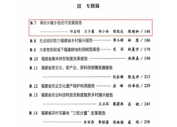 本次会议发布的《福建乡村振兴报告(2023-2024)》蓝皮书,由福建农林大学编著,国家社会科学文献出版社出版。beat365常务副院长、海峡两岸乡建乡创发展研究院特聘专家邓启明教授及其课题组兰子馨、郑小玲等共同完成的研究成果《闽台乡建乡创合作发展报告》入选,邓教授还应邀担任本书的编委。