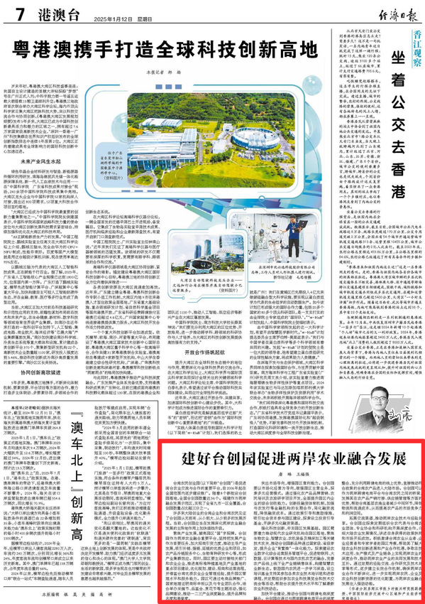 拓展交流渠道,推动两岸农业技术与经验共享。台创园应探索定期组织台农代表与台湾农业团体、专业协会和科研机构开展深度合作,介绍大陆农业发展情况,讲述自身获得的政策扶持和市场开拓成效。积极邀请台湾农业从业者、企业经营者和专家学者赴园区考察,帮助其了解大陆农业科技创新进展和产业合作机遇,争取在技术应用、生产模式及产业链条上实现两岸农业的深度合作,推动两岸农业产业的共同发展和技术互补。通过定期的经验交流、合作研究及技术共享等形式,逐步建立长效合作机制,确保两岸农业合作不断深化,进一步实现两岸农民、企业及农业科技创新资源的优化配置,为两岸农业融合发展注入强劲动能。