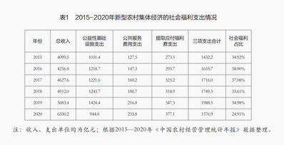 2015—2020年《中国农村经营管理统计年报》数据(如表1)显示,历年来,新型农村集体经济在社会福利(公益性基础设施建设投入、公共服务费用与福利费)的支出占比都较高,大部分年份的三项支出占当年总收入的比重都在34%以上,即使占比最低的2020年,也达到了24.91%,表征了新型农村集体经济能够、而且事实上也承担了强农惠农富农重要载体的功能。