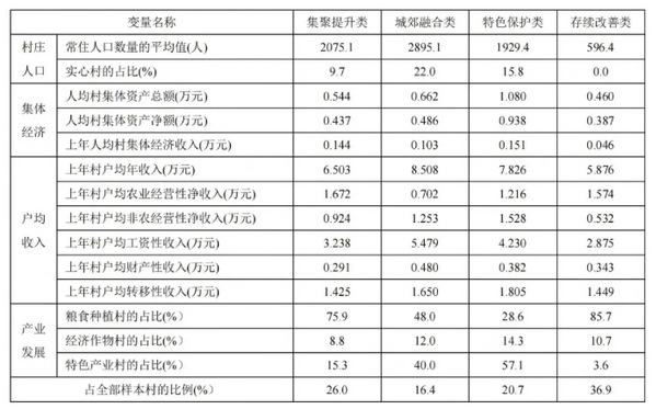 《乡村振兴战略规划(2018-2022年)》将村庄划分为集聚提升类、城郊融合类、特色保护类、搬迁撤并类四类,并提出了相应发展思路。各地在乡村振兴规划实践中根据情况进行了有效探索,补充了存续改善、固边兴边等类别,也有研究提出了不同的分类方案[14]。根据村庄本底特征,结合规划实施和各地乡村振兴实践,本文将样本村分为集聚提升类、城郊融合类、特色保护类和存续改善类。搬迁撤并、固边兴边等其他类型村庄的占比过低,未在存续改善类的基础上细分。城郊融合类包括城市近郊型村庄、县城城关及乡镇驻地型村庄;特色保护类包括拥有特色文化、民俗和自然风光等历史文化传承型和自然生态保护型村庄;集聚提升类包括上述两类村庄之外,人口规模较大、人口增长趋势明显、产业发展有一定基础的中心村;其余村庄则均属于存续改善类村庄。