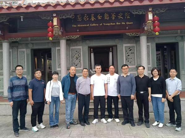 随后调研组一行前往五里古街翁公祠武术馆,深入了解古街发展变迁和白鹤拳在民间的传承与海外交流传播现状。据悉,古街翁公祠武术馆建于1928年,馆在永春白鹤拳教学、宣传与推广等方面发挥了非常重要的作用。调研组与馆长潘琼琪、永春拳协会监事长潘海春等进行了深入交流,一起探讨如何通过“非遗+旅游”“武术+研学”“武术+早操”等模式,更好推动白鹤拳的传承发展,初步商讨了白鹤拳文化在beat365英国官网网站宣传推广的可行性及组织开展大学生暑期社会实践等有效模式,共同探索白鹤拳等非遗文化进高校提升当地特色产品品牌知名度之路