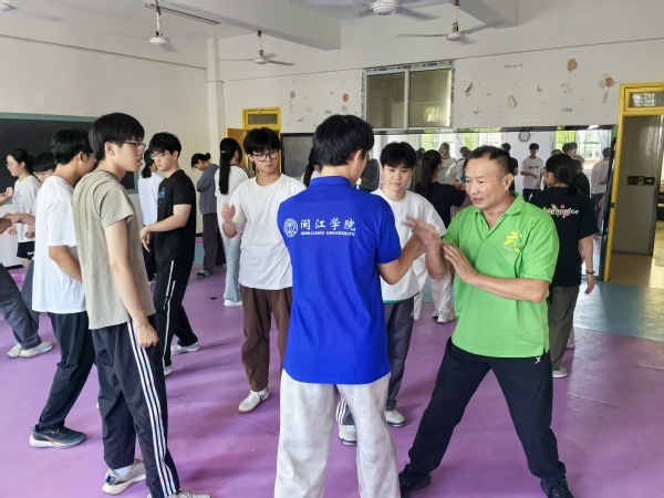 7月5日已是“桃源寻鹤齐飞”实践队集中学习永春白鹤拳的第三日,针对前两天同学们所学的“七步三战”套路,郑老师特意将队员们带到了一个有镜子的教室,并为队员们一个个纠正动作。镜前,郑老师潇洒示范“双枝昭阳”与“双龙探海”时,肩背如弓弦绷展,肘腕似弹簧疾吐,尽显“弹抖劲力”之精髓——力从地起,背传肩,肩催肘,肘送手,如白鹤振羽般短促凌厉。队员们一个个依样演练,却见镜中己身动作滞涩。郑馆长以掌轻抵学员腰脊,要求:“丹田沉气,意贯四梢!永春拳讲究‘吞浮沉吐’,吞气如蓄潮,吐劲似崩岸!”据此引导众人以腹式呼吸配合招式开合:双掌昭阳上托时深吸聚气,探海下劈时骤呼发力。顷刻间,训练馆内气息翻涌如潮。为了强化力量与实战感,郑老师又引导实践队员两两成组进行切磋。在挑手格挡、青龙滚珠等对练中,面对一次次来自对方的攻与防,队员们深刻体会到了练习和实战的差距,特别是面对攻击时脚步与重心易失稳。“我们小时候每日必练脚步和对练,力气就是这样练出来的,”郑馆长鼓励道,“出招前深吸气,出招同时呼喊,会更有劲,也更有气势。”此刻,训练馆呼喝声此起彼伏,同学们也渐入佳境。当夕阳漫过镜墙,实践队员们浸透汗水的练功服紧贴脊背,招式也愈发熟练。