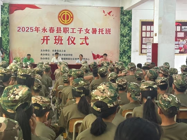 上午9点,永春英才培训学校隆重举行了2025年永春县职工子女暑托班开营仪式,成功吸引了从幼儿园大班到初中三年级的100多位学生踊跃参与。县总工会副主席王一烽首先应邀进行开班致辞,他对实践队的到来表示热烈的欢迎和衷心的感谢;表示职工子女参加暑托班活动,既是一次增长才干、开拓视野的机会,也是一次体验集体生活、感受友谊、学会交流互动的好机会。仪式上,福建永春县永春拳协会副会长、英才武术研究会会长郑为民老师昔日的弟子们用心展示了他们日益精湛的白鹤拳技艺,赢得现场暑托班学员和武术爱好者们阵阵惊叹。尽管开营伊始,部分初次离家的孩子难掩不舍;然而,在教官示范“抱拳礼”等的引导下,在同伴齐声呼喝“高探马步”、“半月沉江”等招式名称的氛围中,不同年级的孩子们都逐渐凝神专注,热情投入到武术学习中。至下午两点再次集中训练时,多数孩子已能在“不丁不八步”定势中展臂如鹤;离校时更是笑容洋溢,纷纷与新结识的朋友相约次日再见。据了解,此次活动主要是县总工会为解决职工子女暑期“看护难”问题,也让职工子女过上一个安全、快乐、富有意义的暑假,故在永春英才培训学校设立“2025年永春县职工子女暑托班”,为同学们提供为期4周的“托管+教育+实践”一体化公益服务;具体服务内容,涵盖永春白鹤拳、手工制作、暑假作业辅导及书画、篮球、研学活动、户外拓展等多项课程与特色活动,为孩子们提供丰富多彩的暑期体验。这也让实践队员们深刻感受到了永春县总工会对广大职工及其子女的关爱与补贴力度,好让更多职工的孩子一起前来交流学习,同时“让非遗传承惠及更多人”真正落到了实处。